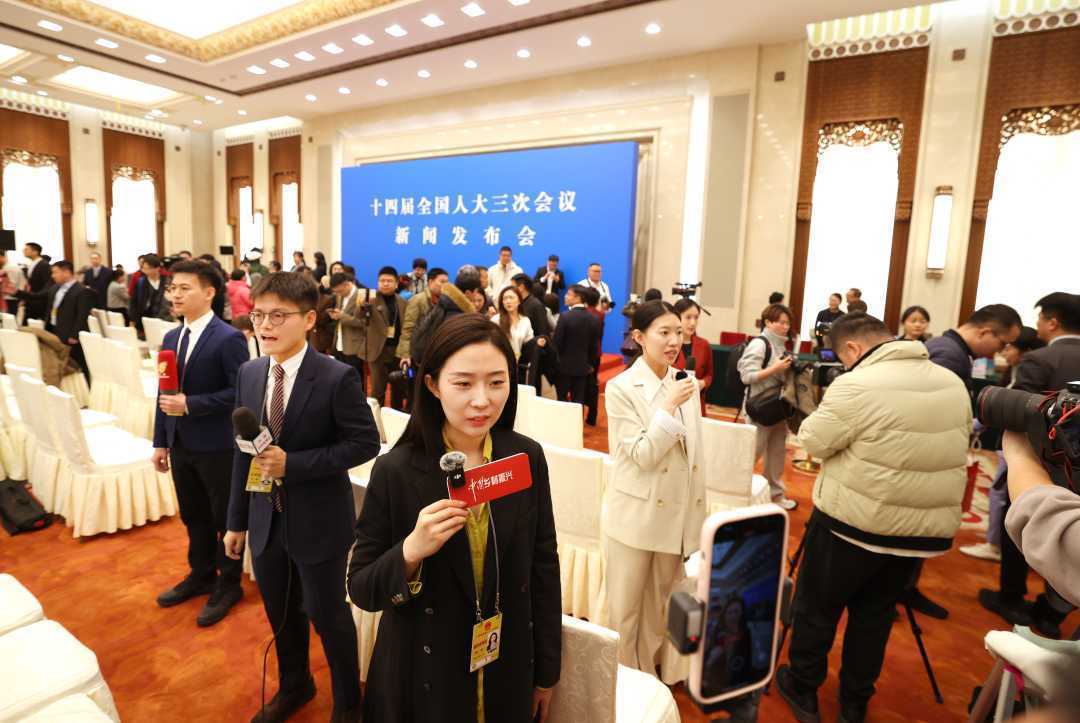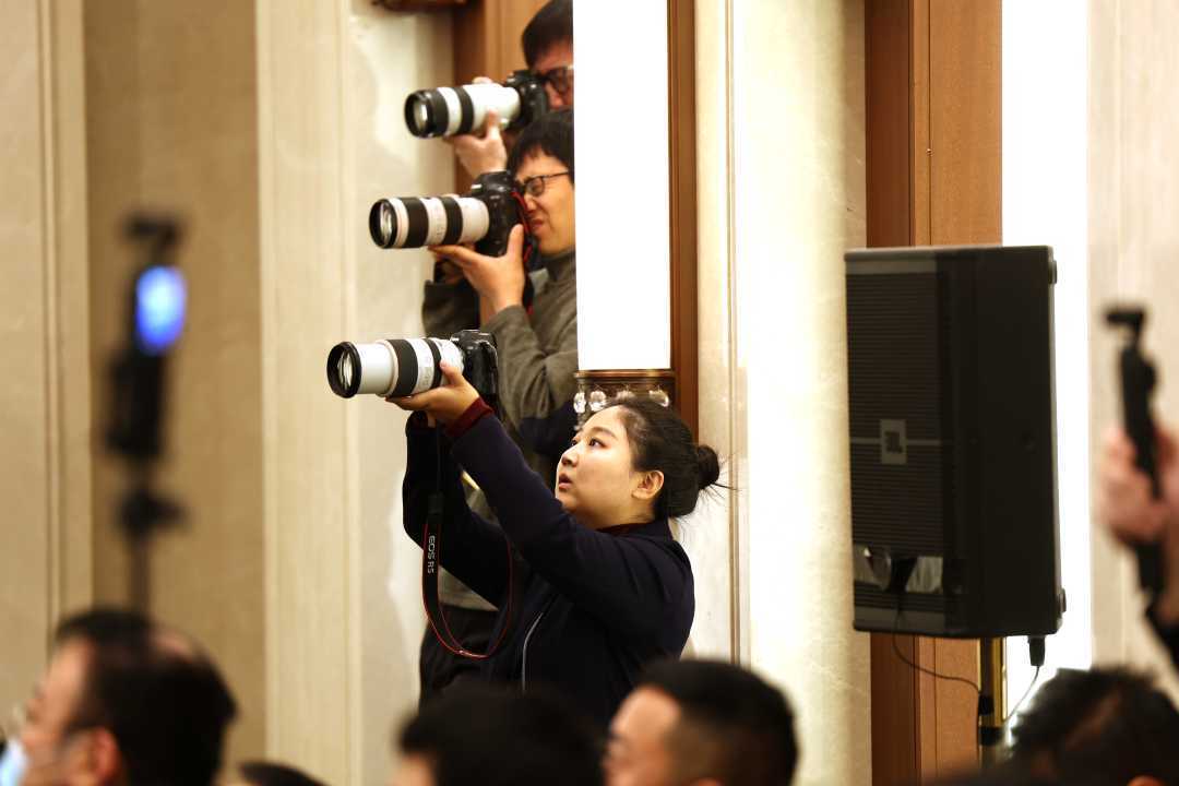 3月4日,十四届世界东谈主大三次会议在北京东谈主民大礼堂举行新闻发布会。大会发言东谈主娄节约就大会议程和东谈主大使命关连问题回话中外记者发问。图为记者在现场采访。经济日报记者雅瞻念贵摄