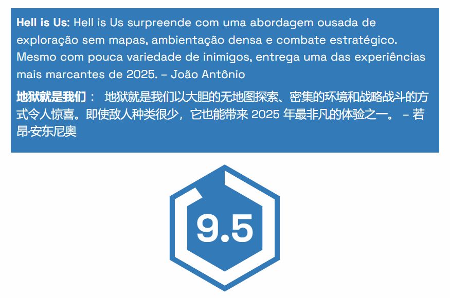 游戏媒体comboinfinito近日对类魂新作《地狱即咱们》(Hell is Us)进行了评测,并给出了9.5分的惊艳评价,将其誉为“2025年最伟大的游戏之一”。