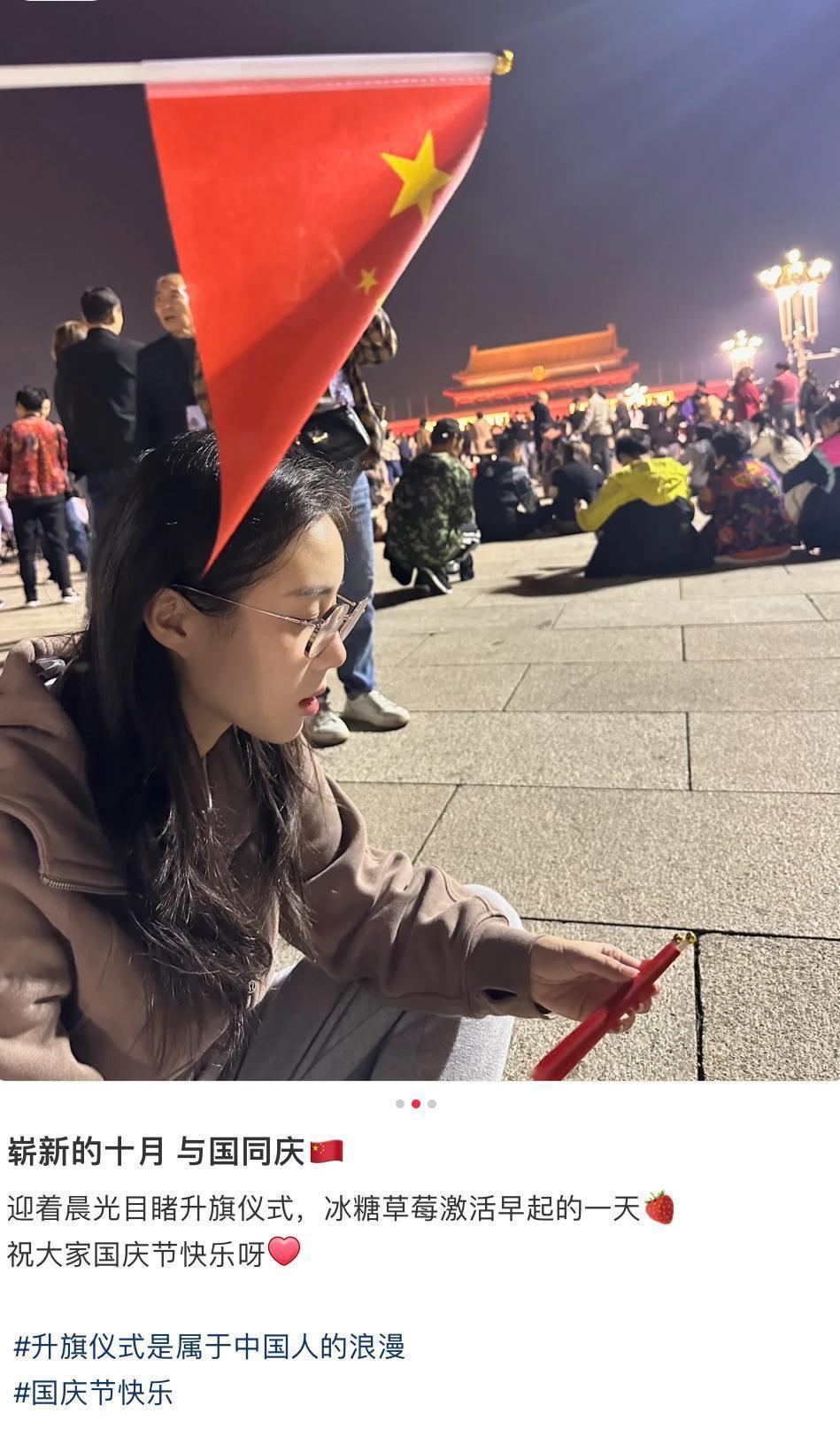 但是,何超欣的国庆行程并不啻于此。为了亲目睹证五星红旗镇静腾飞的尊容时刻,她居然在凌晨就前去天安门广场列队等候升旗庆典。相片中,她戴着眼镜,素颜朝天,身穿厚厚的卫衣和棉裤,起步当车,涓滴莫得朱门令嫒的娇气,有的仅仅对故国的诚实之心。为了能找到一个好位置,她早早地就来到了广场,与来自寰宇各地的同族全部恭候日出。
