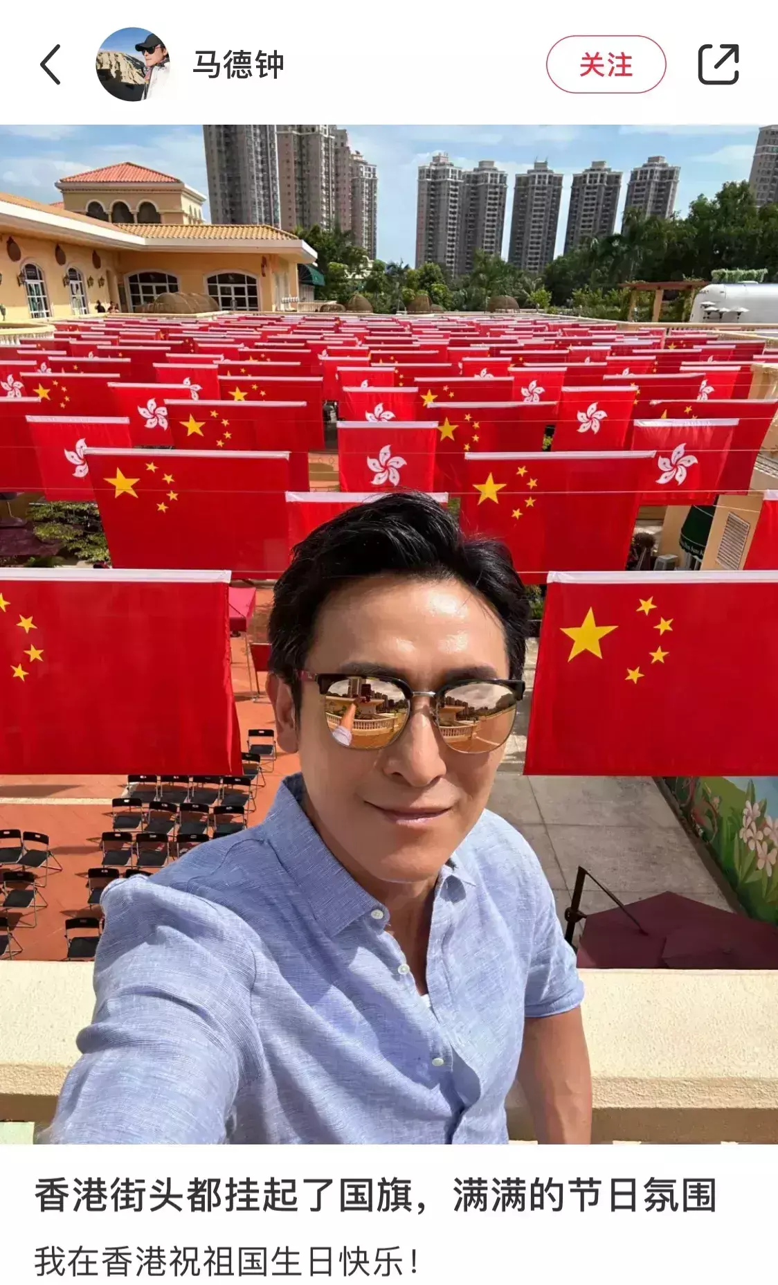 香港艺东说念主马德钟也在应付平台上共享了香港街头的气候。相片中,香港街头红旗漂荡,飘溢着喜庆的节日腻烦。马德钟配文“我在香港,祝故国寿辰平定!”肤浅的一句话,却抒发了他算作别称香港市民对故国的喜爱之情。